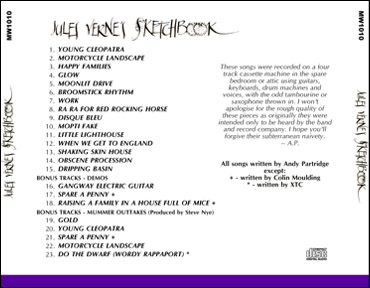 XTC "Jules Verne's Sketchbook" CD"Jules Verne's Sketchbook" was a fan-club only cassette release of demos by XTC songwriter Andy Partridge.The out-of-print tape had become highly sought-after by fans of the band, and an inferior bootleg was making the rounds. For a small group of fans, I transferred my copy of the tape to CD adding some demos and outtakes from the same period. The cover and interior liner notes were copied directly from the cassette release. Notes for the bonus tracks were scanned from a copy of a letter handwritten by Andy Partridge himself!