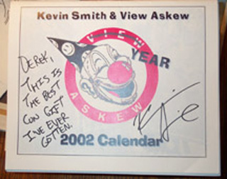 View Askew 2002 CalendarI've been a fan of director Kevin Smith since Clerks hit theaters in 1994.In 2001, Jay and Silent Bob Strike Back was released, bringing to an end the "View Askew-niverse" of interconnected characters and stories. To commemorate the "closing" of the series, I created a year 2002 calendar, giving the top of each month to the movies, comics and cartoons of the Askew-niverse. A copy of the finished product was presented to Kevin Smith himself at MegaCon 2002 in Orlando, FL. My own personal copy was then autographed by Smith. Sample pages are below the cover image. |